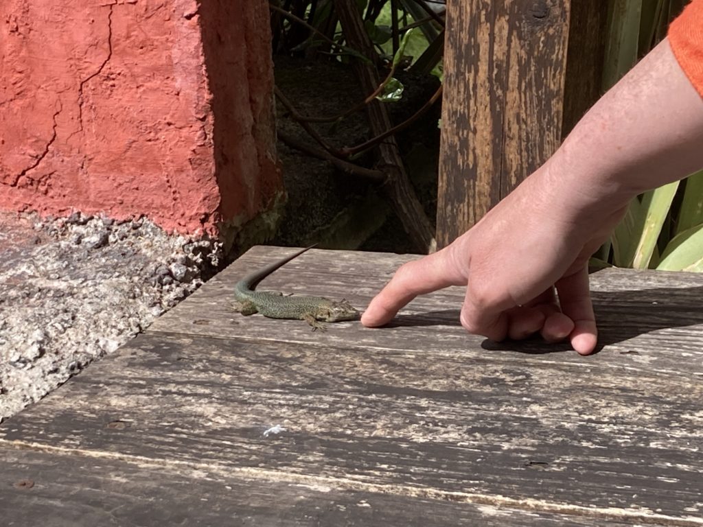 25 avril 2026 Bêbêtes de printemps Les chevreaux naissent à la douzaine, notre lézard domestique sort de son hibernation… Et Domino demande des caresse sur fond de montanha.
